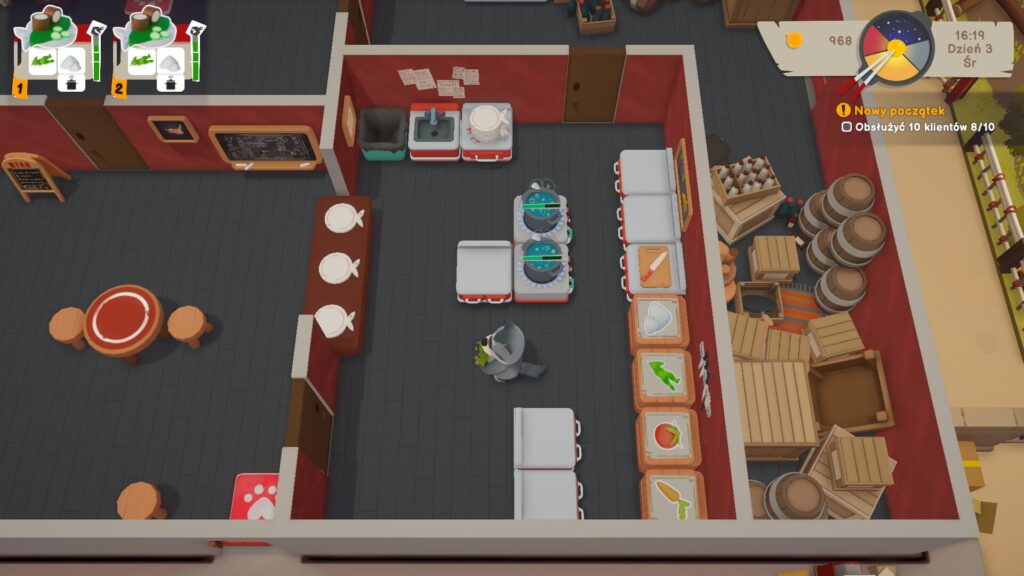 Jak działają wspomniane mechanizmy? Całkiem dobrze. Są one łudząco podobne do zastosowanych we wcześniej wspomnianym tytule. Jednak w połączeniu z bardziej rozbudowaną mechaniką pełnienia funkcji restauratora sprawiają, że rozgrywka jest bardzo przyjemna, a podobieństwa nie wpływają na poczucie powtarzalności znanych schematów. Warto tutaj dodać, że cały układ restauracji, liczba posiadanych palników, desek do krojenia, czy skrzyń na produkty zależy od nas i od naszego budżetu. Podobnie godziny otwarcia – jeżeli nie podejdziemy do zlokalizowanej przy drzwiach tabliczki i nie otworzymy restauracji, klienci nie będą przychodzić. Czas pracy również jest normowany, ponieważ w Pao Pao mamy cykl dnia i nocy. Co więcej, po skończonej harówce możemy zwyczajnie iść spać. To jest dopiero luksus!